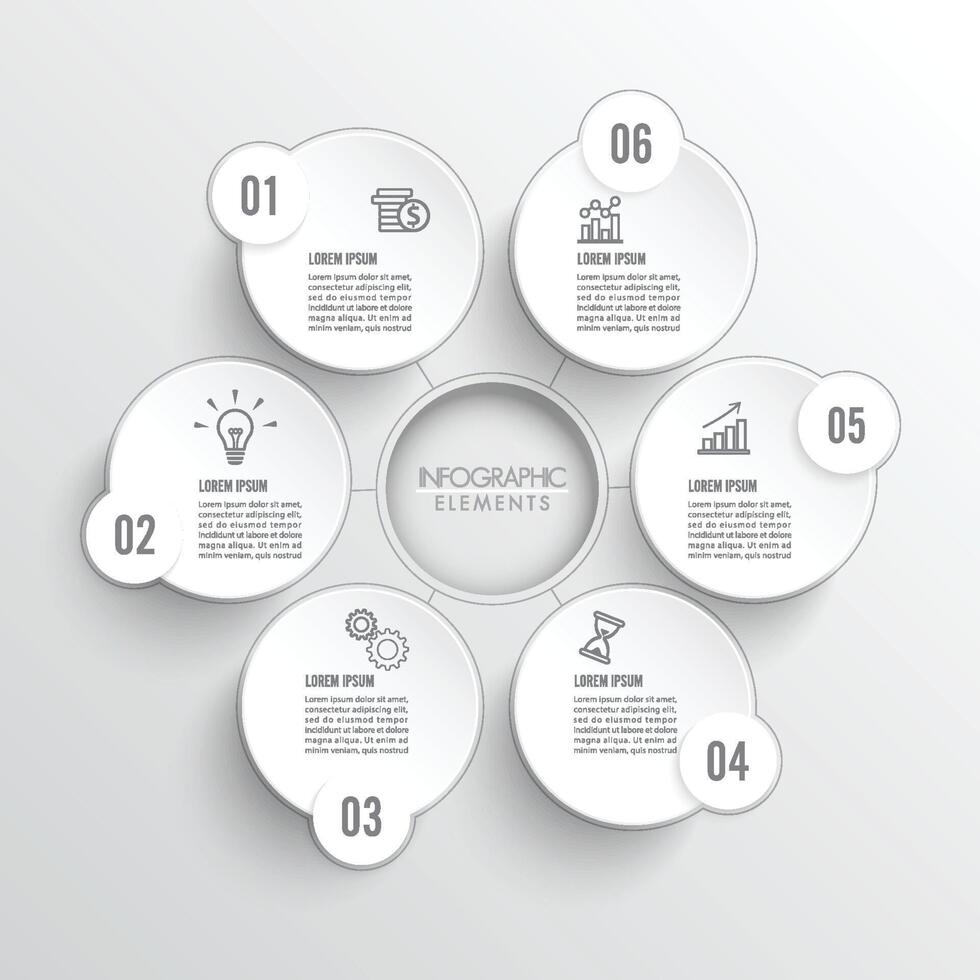 Vector infographic template with 3D paper label, integrated circles. Business concept with 6 options. For content, diagram, flowchart, steps, parts, timeline infographics. Pro Vector