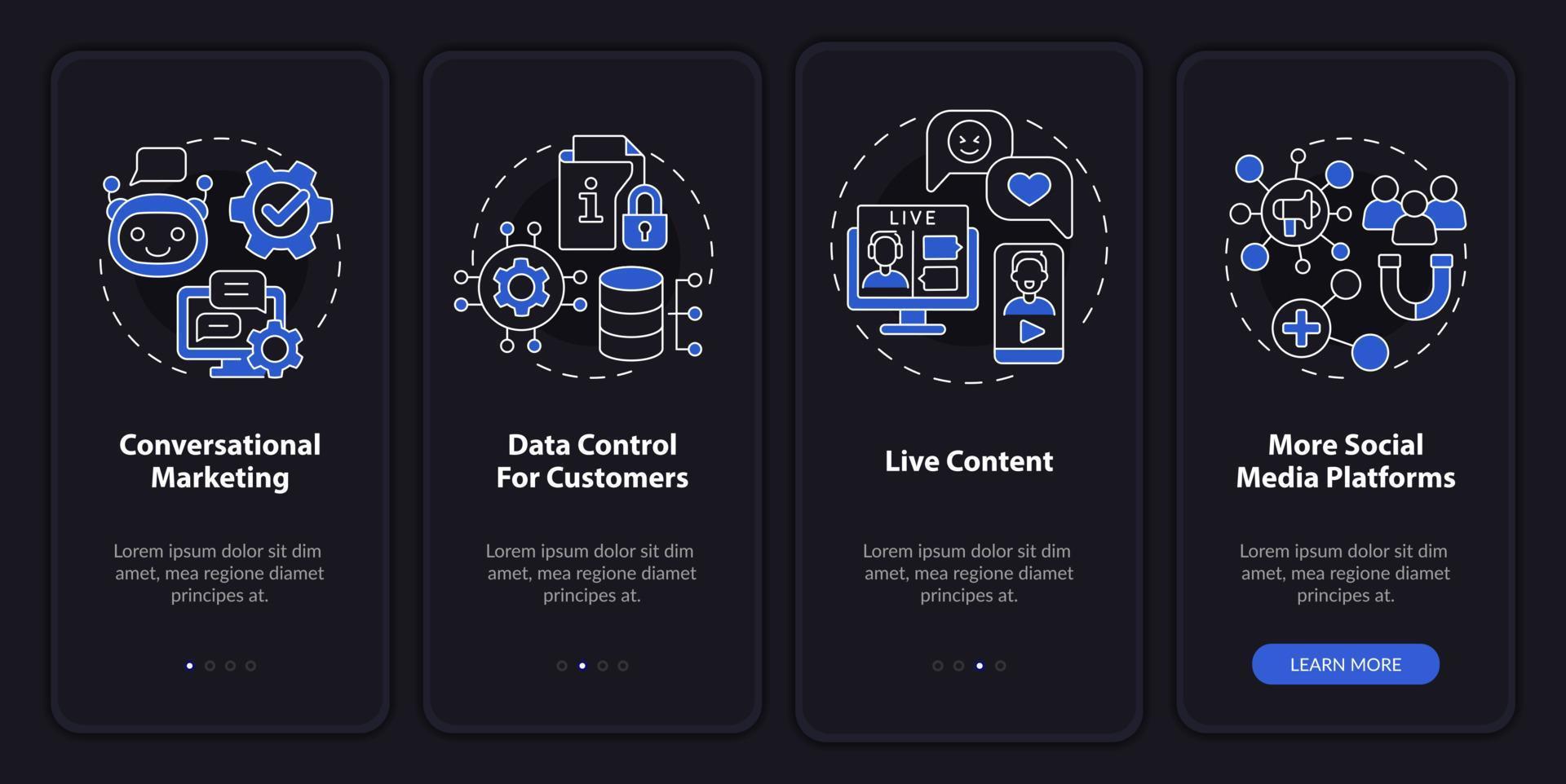 Modern marketing trends night mode onboarding mobile app screen. Ads walkthrough 4 steps graphic instructions pages with linear concepts. UI, UX, GUI template. Myriad Pro-Bold, Regular fonts used Pro Vector
