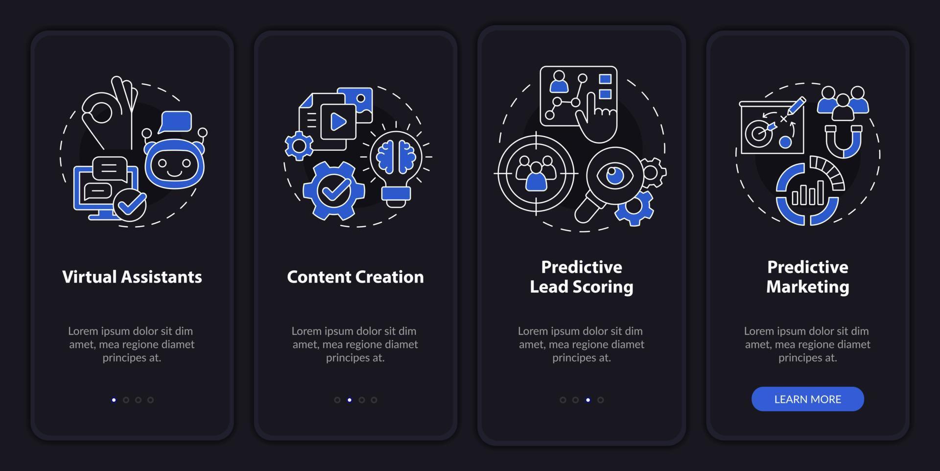 Usage of AI in marketing night mode onboarding mobile app screen. Walkthrough 4 steps graphic instructions pages with linear concepts. UI, UX, GUI template. Myriad Pro-Bold, Regular fonts used Pro Vector