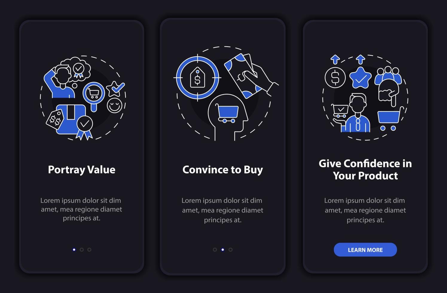 Best pricing strategy components night mode onboarding mobile app screen. Walkthrough 3 steps graphic instructions pages with linear concepts. UI, UX, GUI template. Myriad Pro-Bold, Regular fonts used Pro Vector