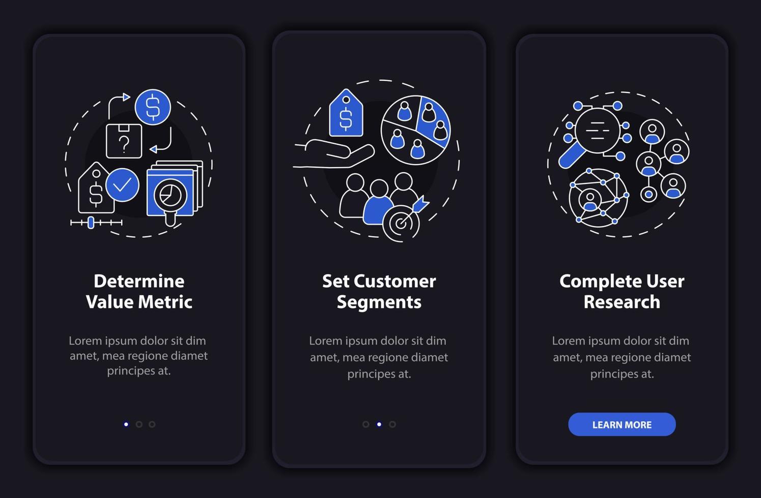 Pricing strategy development night mode onboarding mobile app screen. Walkthrough 3 steps graphic instructions pages with linear concepts. UI, UX, GUI template. Myriad Pro-Bold, Regular fonts used Pro Vector