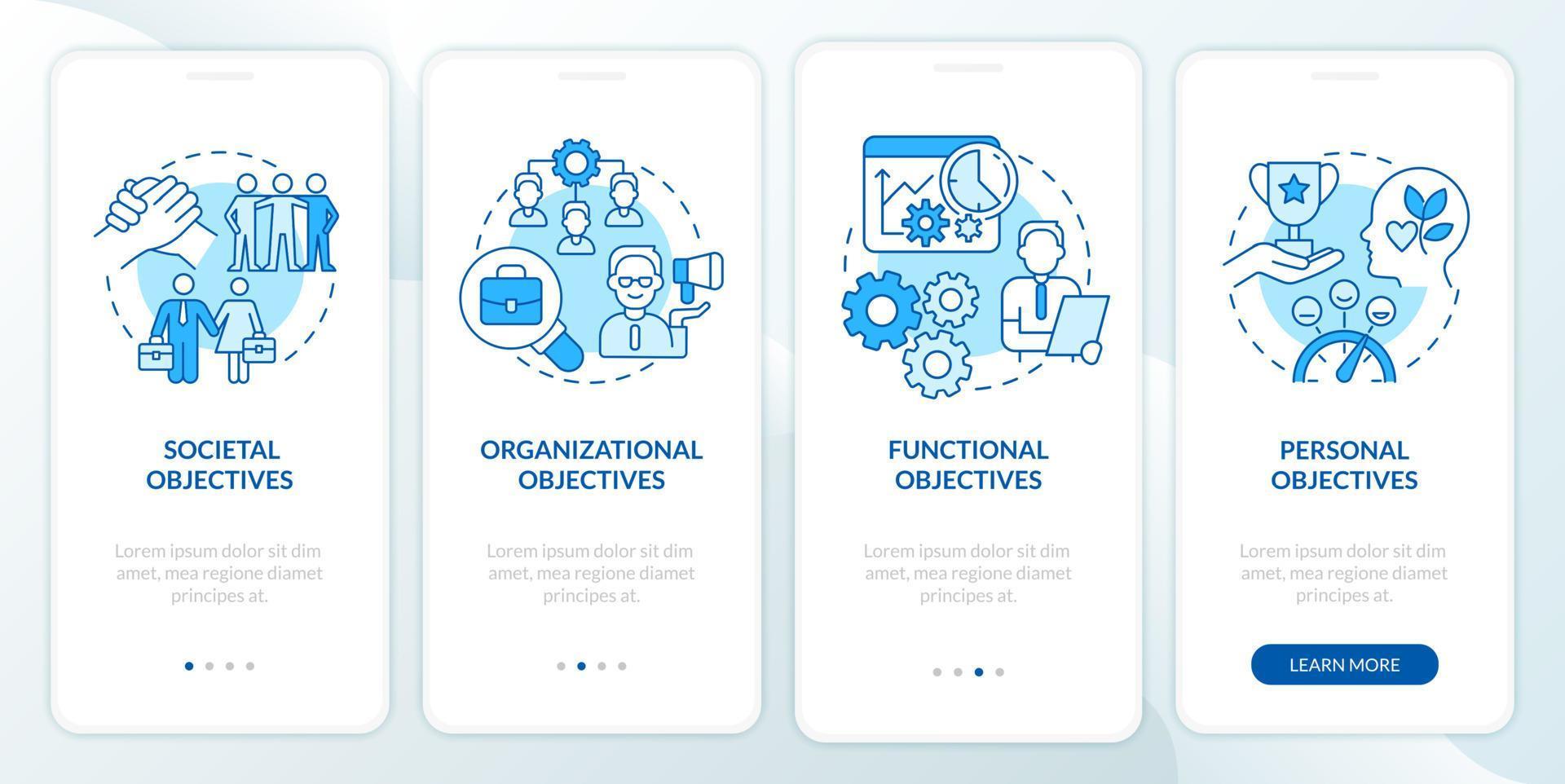 Objectives of hr management blue onboarding mobile app screen. Walkthrough 4 steps graphic instructions pages with linear concepts. UI, UX, GUI template. Myriad Pro-Bold, Regular fonts used Pro Vector