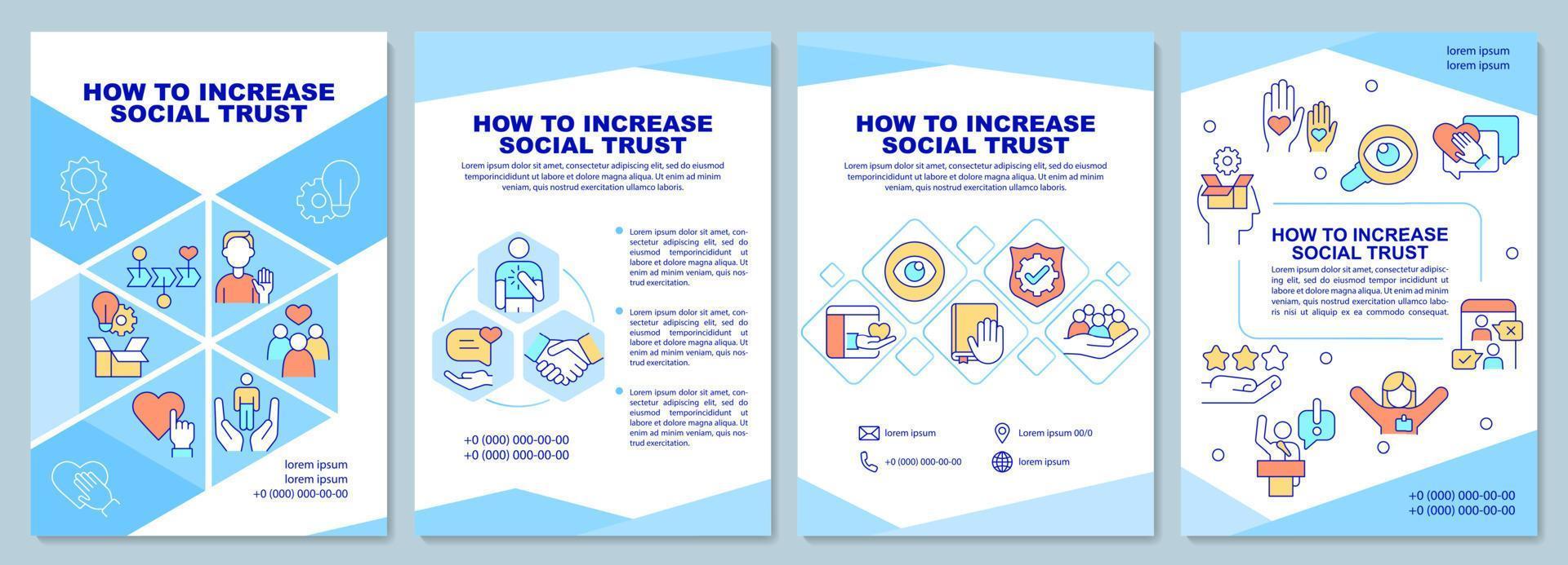 How to increase social trust blue brochure template. Booklet print design with linear icons. Vector layouts for presentation, annual reports, ads. Arial-Black, Myriad Pro-Regular fonts used Pro Vector