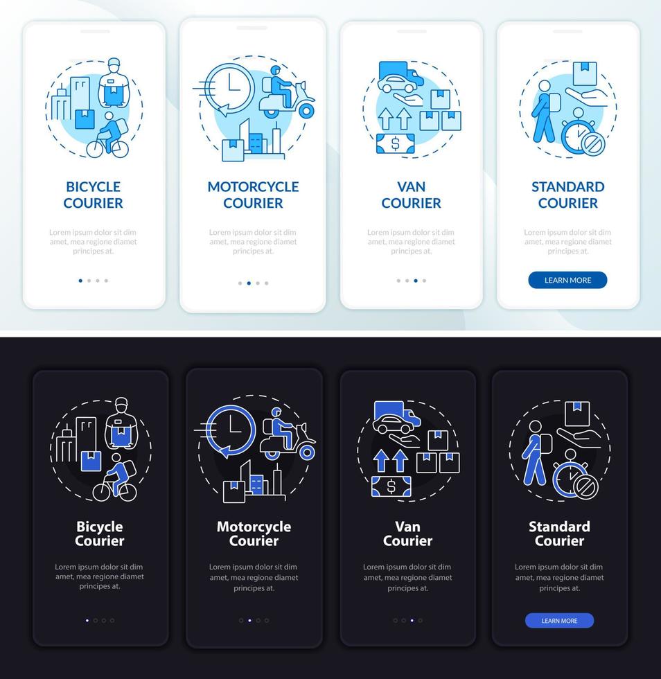 Courier business day and night theme onboarding mobile app screen. Delivery service walkthrough 4 steps graphic pages with linear concepts. UI, UX, GUI template. Myriad Pro-Bold, Regular fonts used Pro Vector