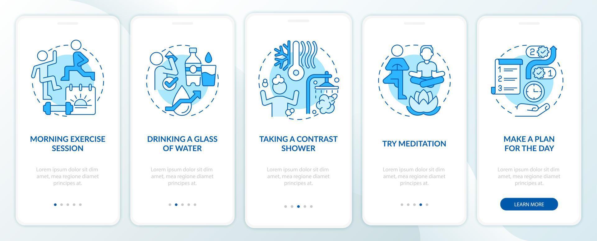 Daily routine blue onboarding mobile app screen. Selfcare walkthrough 5 steps graphic instructions pages with linear concepts. UI, UX, GUI template. Myriad Pro-Bold, Regular fonts used Pro Vector