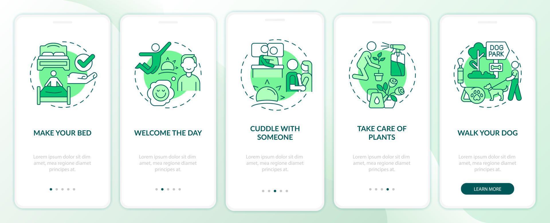 Everyday routine tips green onboarding mobile app screen. Starting day walkthrough 5 steps graphic instructions pages with linear concepts. UI, UX, GUI template. Myriad Pro-Bold, Regular fonts used Pro Vector