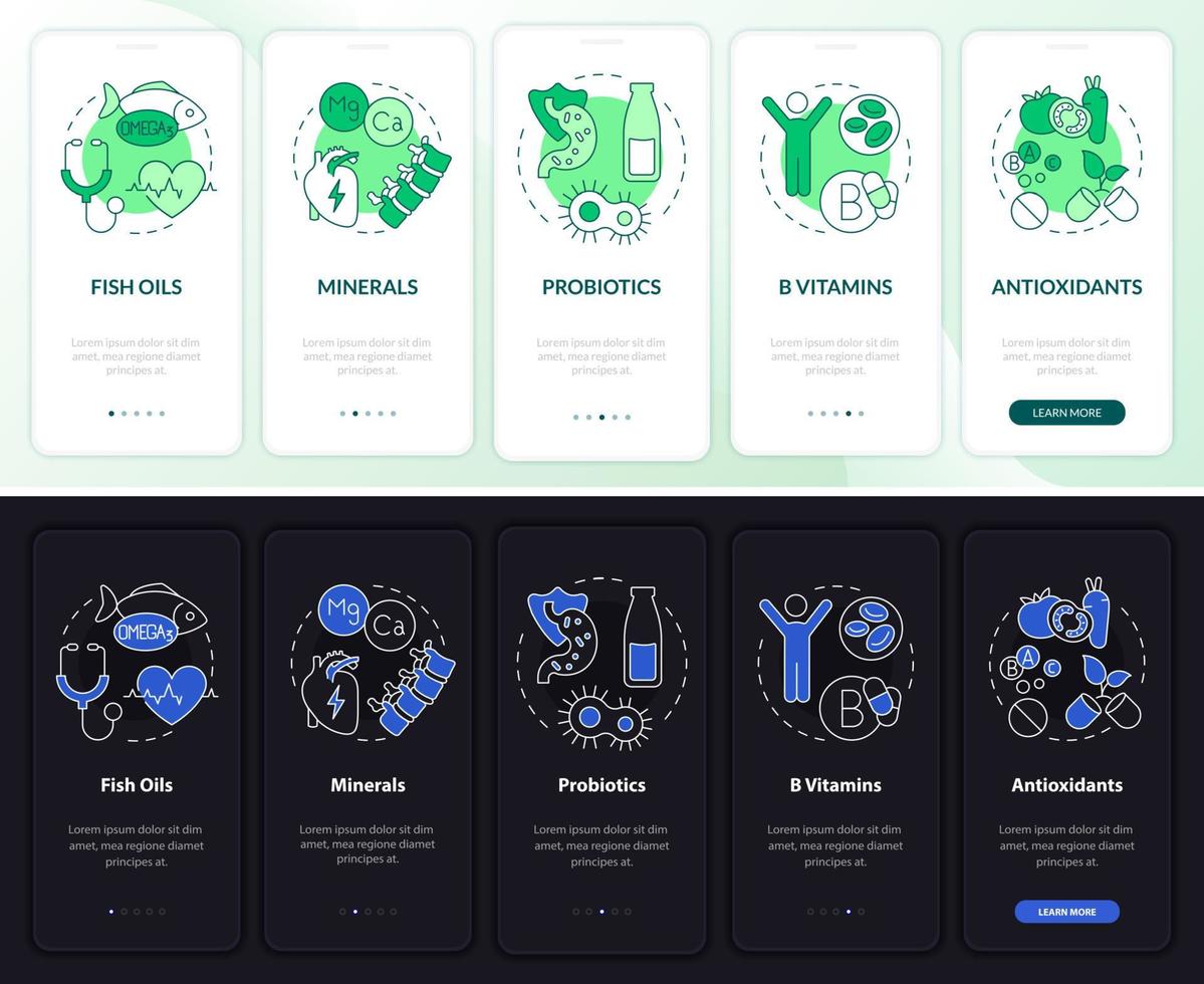 Dietary supplements night and day mode onboarding mobile app screen. Food walkthrough 5 steps graphic instructions pages with linear concepts. UI, UX, GUI template. Myriad Pro-Bold, Regular fonts used Pro Vector