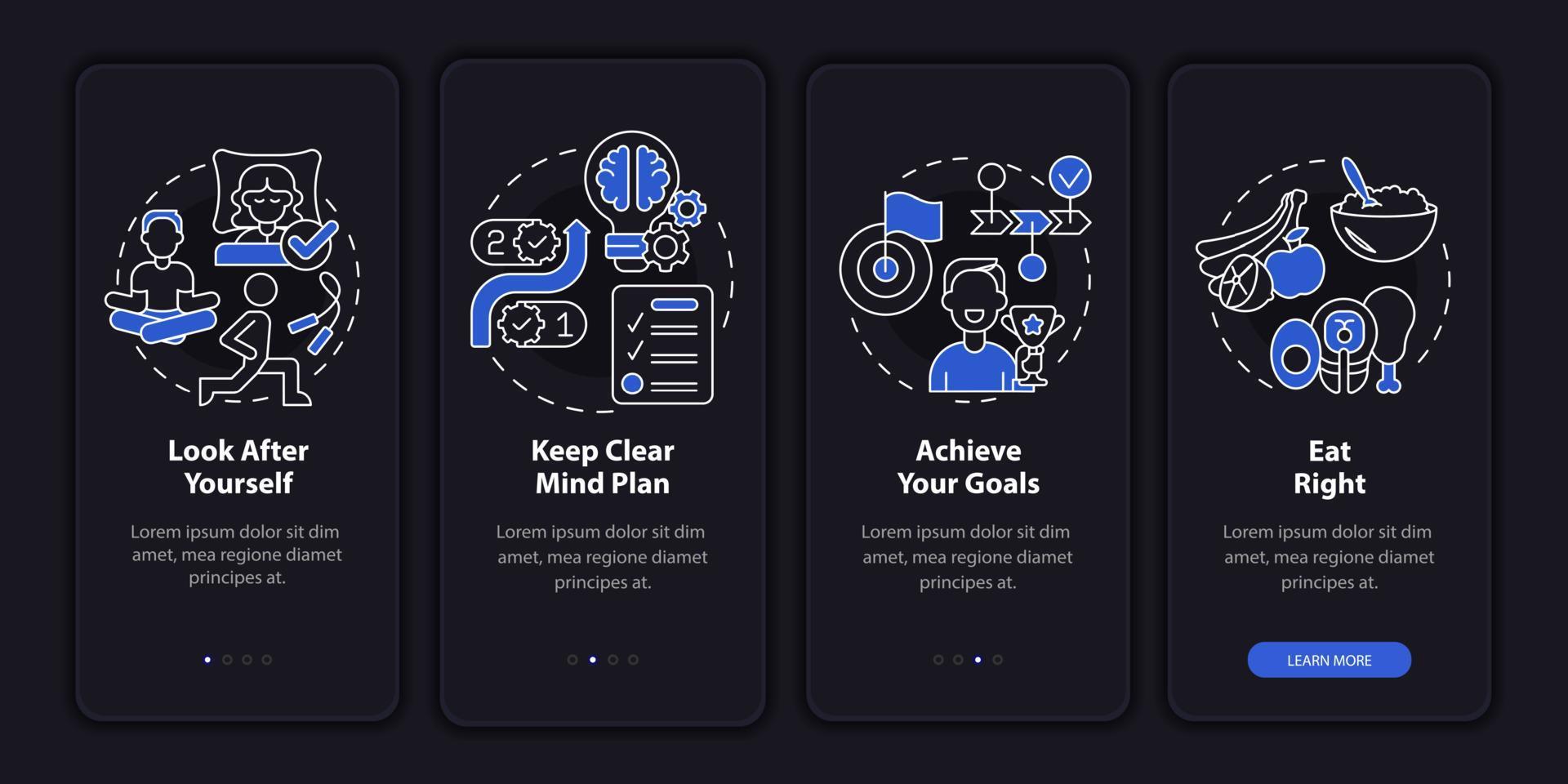 Well balanced life night mode onboarding mobile app screen. Lifestyle walkthrough 4 steps graphic instructions pages with linear concepts. UI, UX, GUI template. Myriad Pro-Bold, Regular fonts used Pro Vector