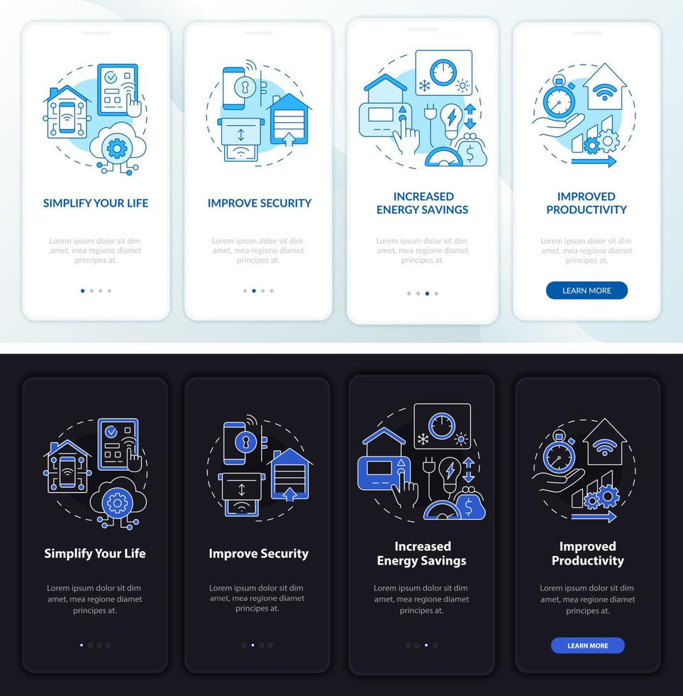 Reasons for home automation night, day mode onboarding mobile app screen. Walkthrough 4 steps graphic instructions pages with linear concepts. UI, UX, GUI template. Myriad Pro-Bold, Regular fonts used Pro Vector