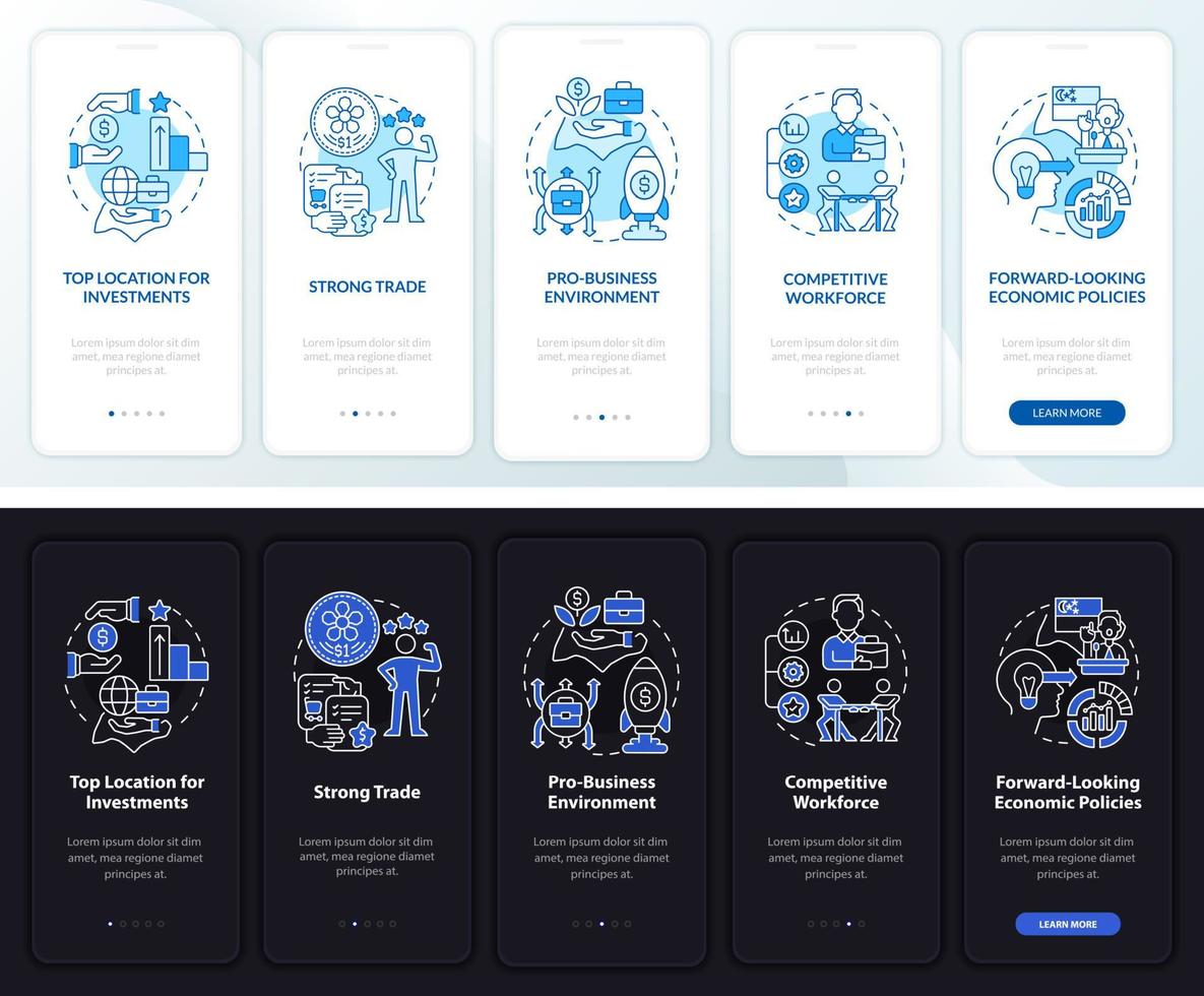 Business in Singapore night and day mode onboarding mobile app screen. Walkthrough 5 steps graphic instructions pages with linear concepts. UI, UX, GUI template. Myriad Pro-Bold, Regular fonts used Pro Vector