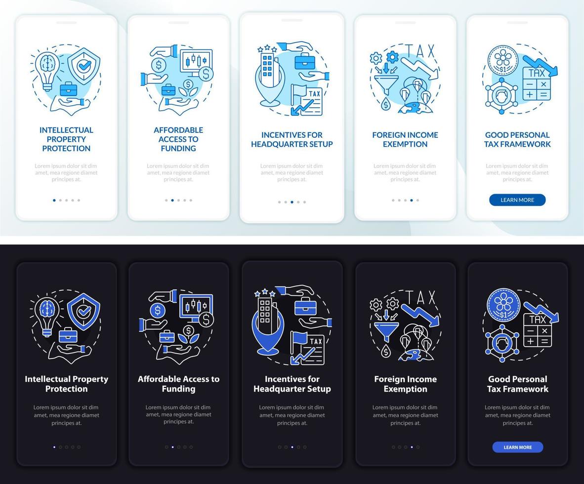 Starting new business night and day mode onboarding mobile app screen. Walkthrough 5 steps graphic instructions pages with linear concepts. UI, UX, GUI template. Myriad Pro-Bold, Regular fonts used Pro Vector