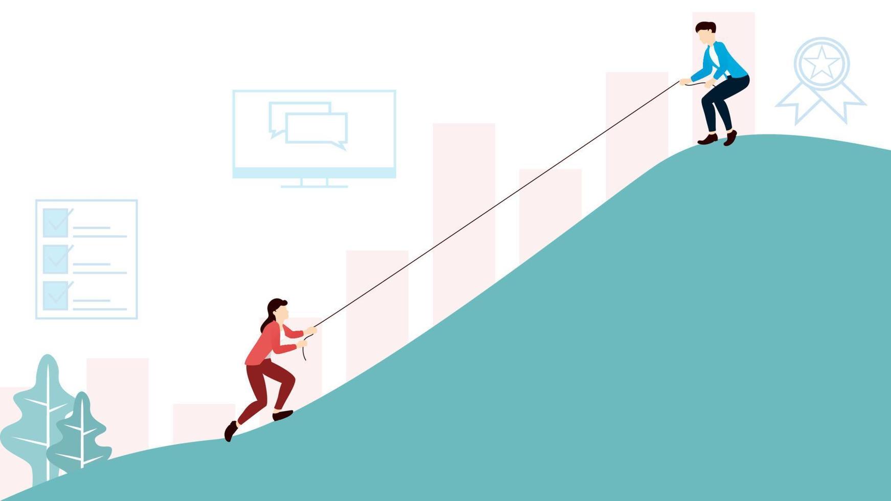 man helping woman to reach on top, good leader - business concept vector illustration on white background with objects like bar graph, task list, chat in monitor and achievement badge. Pro Vector