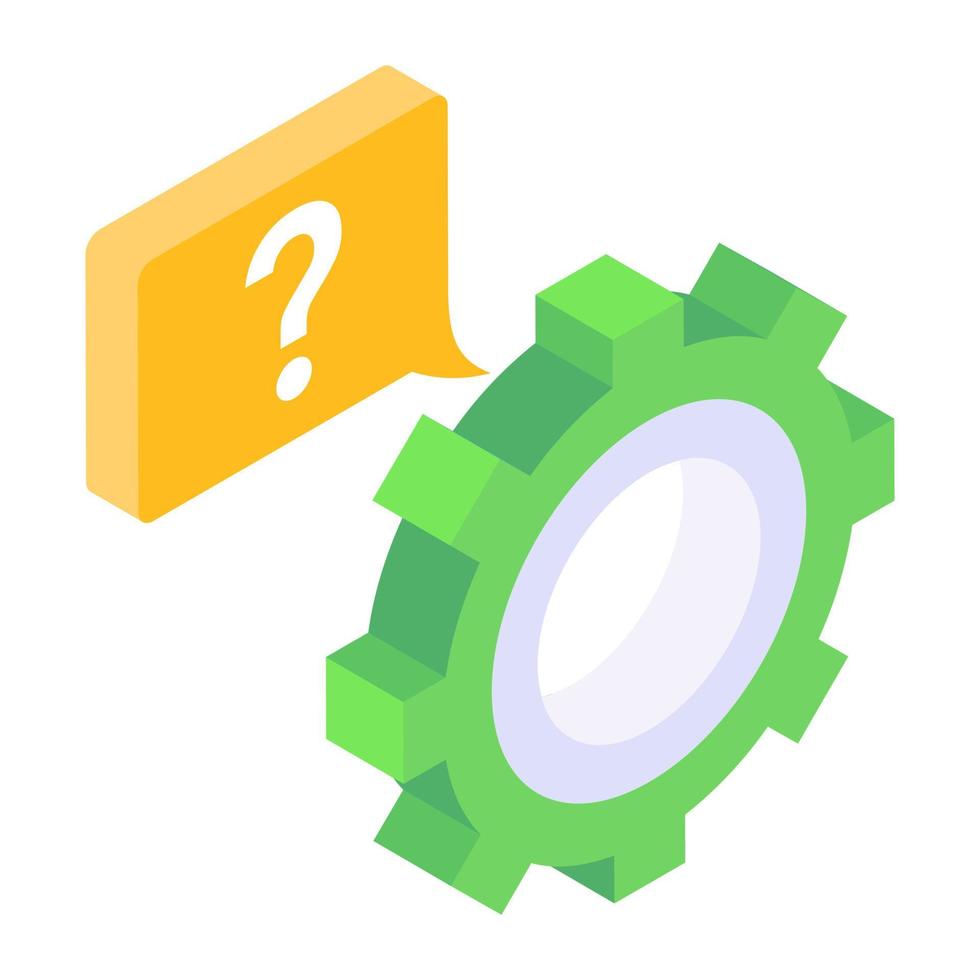 Gear with question mark inside chat bubble, conceptual icon of help settings in isometric design Pro Vector