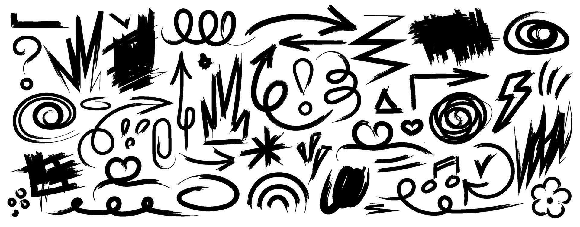 Collection of hand drawn doodles and squiggles for text highlighting sign. Set of design elements with texture of scribbles. Black line brush stroke. Simple cute swashes, Pro Vector