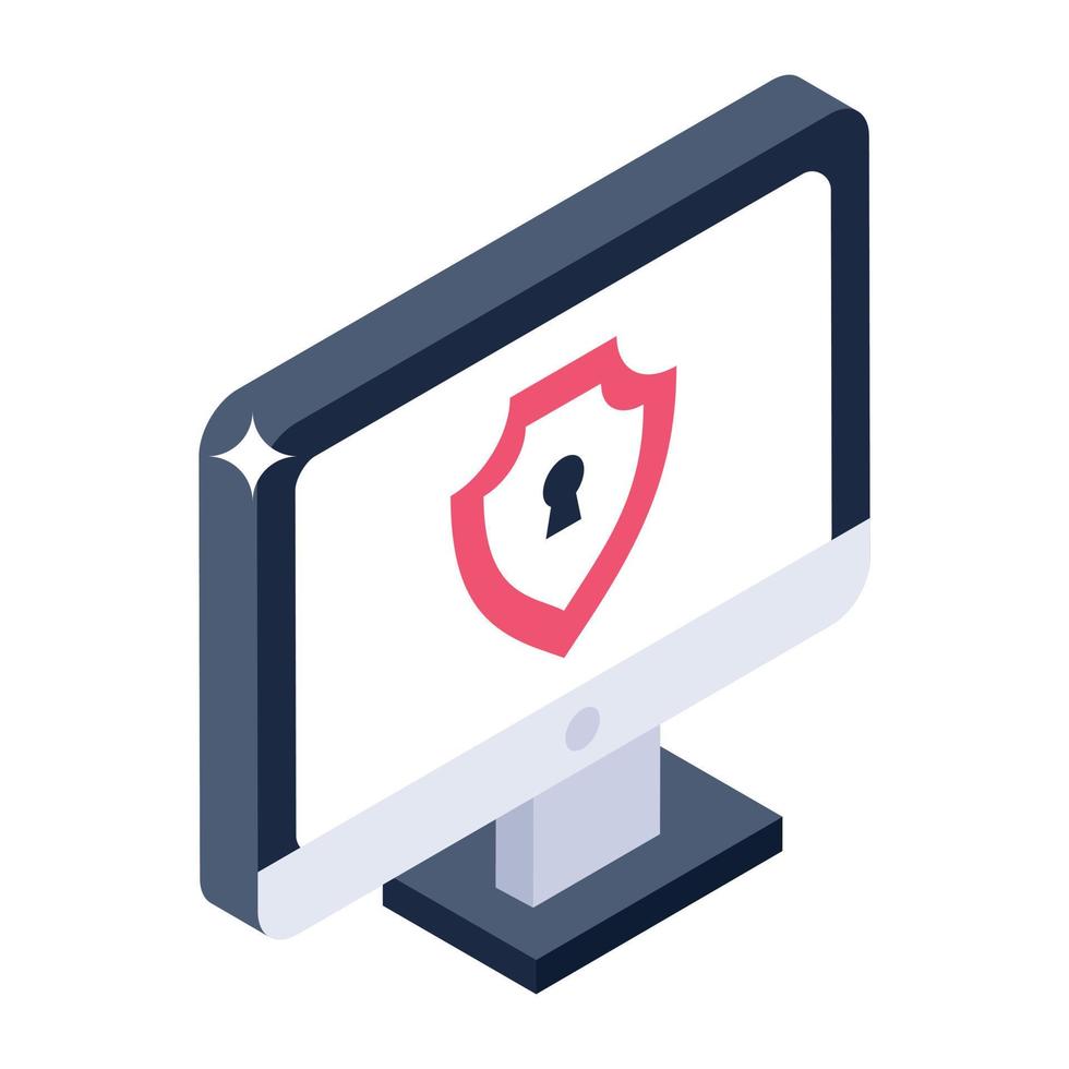 Locked shield inside monitor showing isometric icon of safe computer Pro Vector