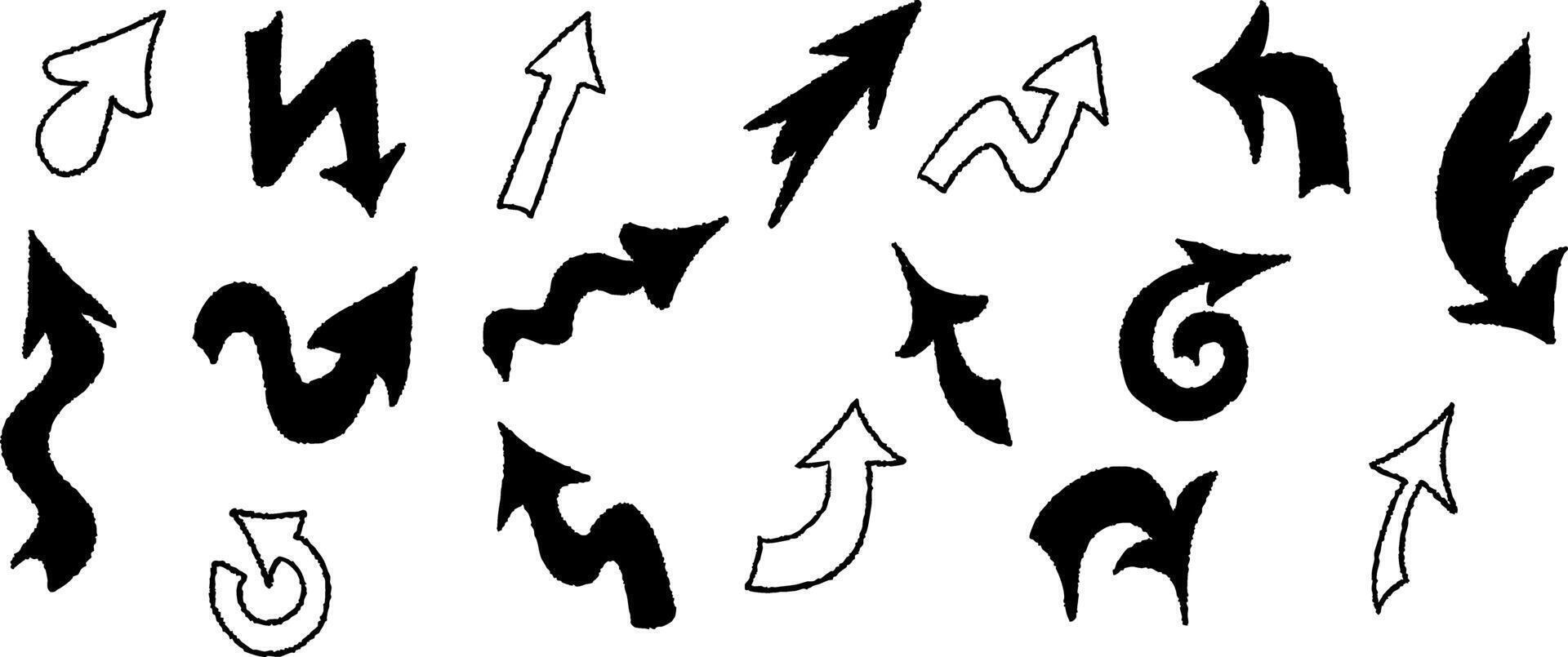 Collection of hand drawn arrows in various shapes and styles with bold and sketchy outlines. Concept of direction, navigation and visual emphasis in creative design Pro Vector
