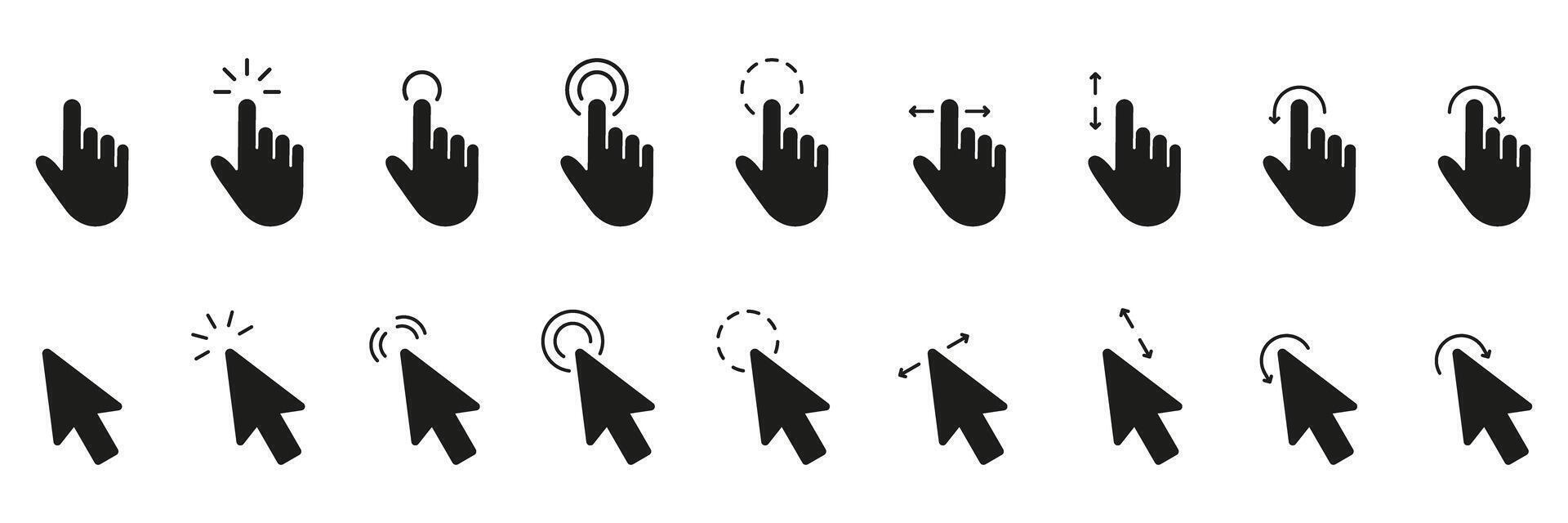 Hand Gesture And Cursor Click Solid Icon Set. Finger Tap And Mouse Pointer Silhouette Symbol Collection. Isolated Illustration Pro Vector