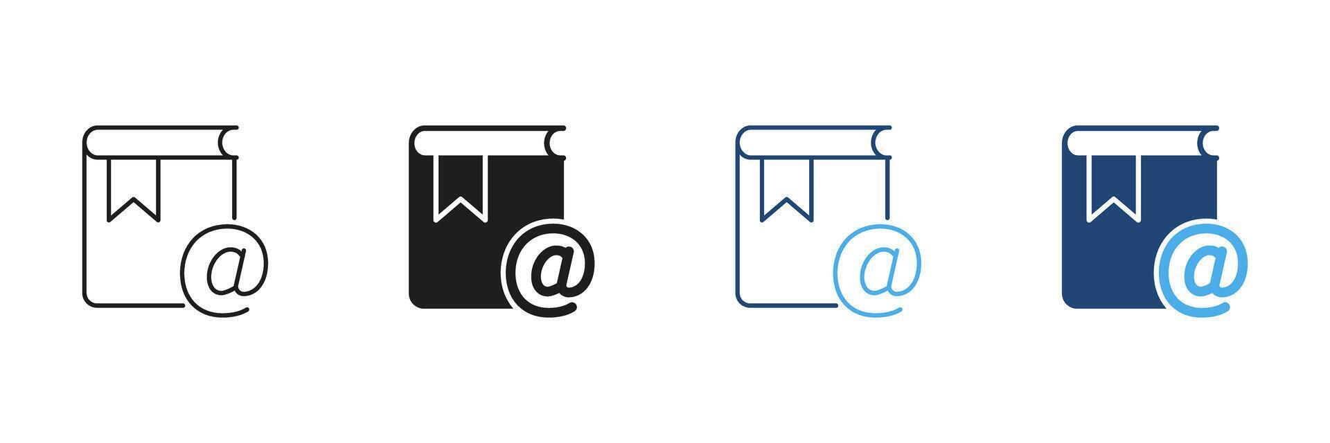 Book With At Symbol Icon Set. Digital Address Book, Email Directory, And Contact Management Outline And Silhouette Symbol Collection. Communication And Networking. Isolated Illustration Pro Vector