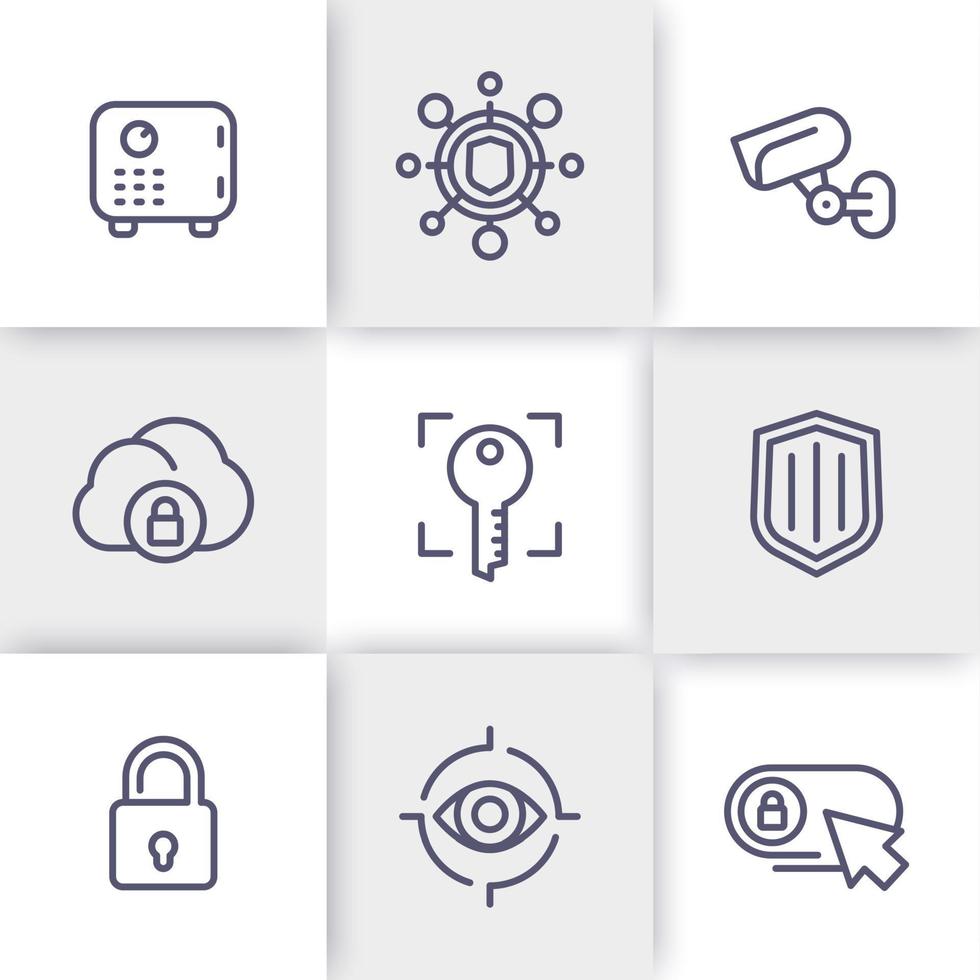 Security line icons set, secure transaction, strongbox, video surveillance, authentication, biometric recognition, safety Pro Vector