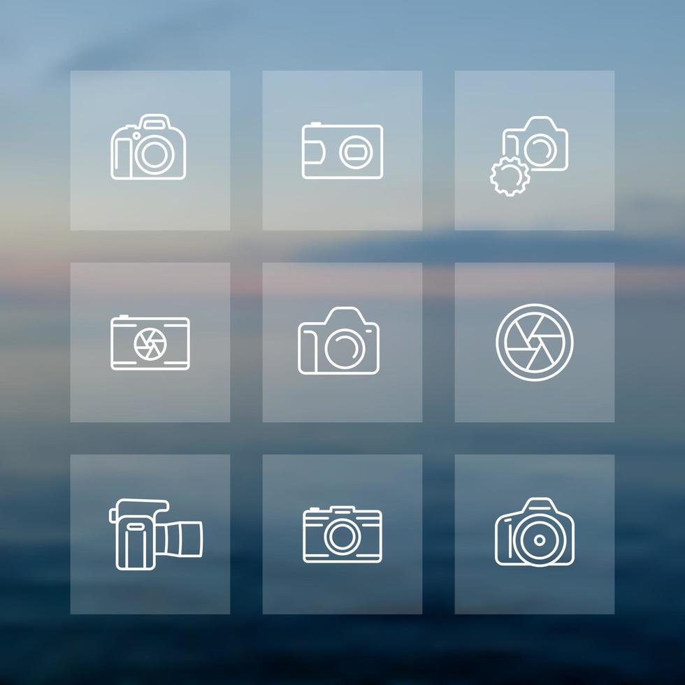 camera, photography line icons set, aperture, compact, dslr, slr camera, front and side view Pro Vector