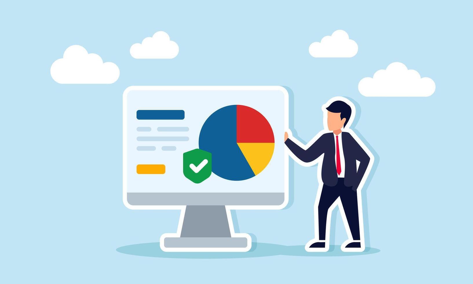 Businessman standing next to monitor displaying data pie chart and green checkmark shield illustration of validating and verifying profit-sharing agreement in business Pro Vector