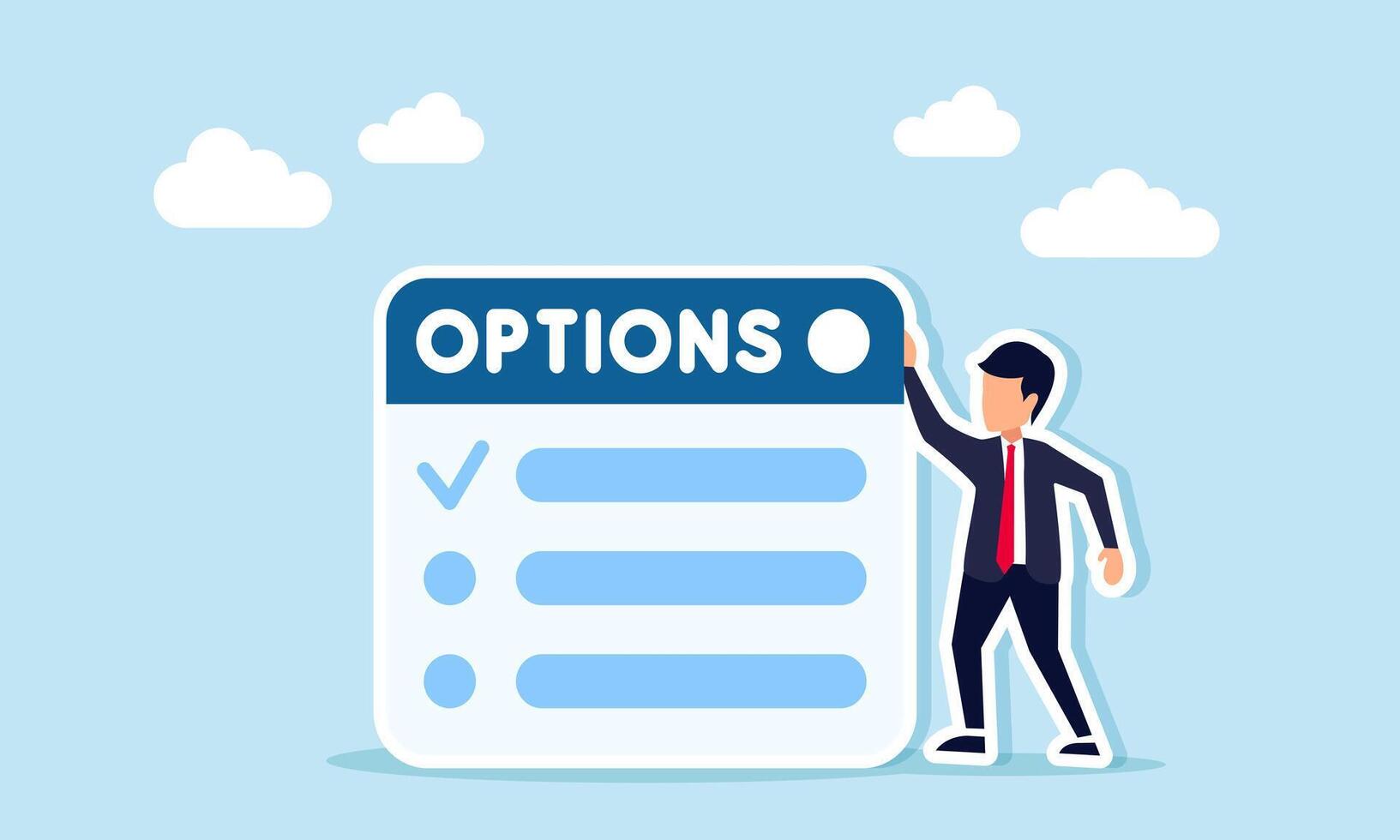 Businessman standing beside an app interface with OPTIONS written on it, illustration of choices and inputs related to business development and progress Pro Vector