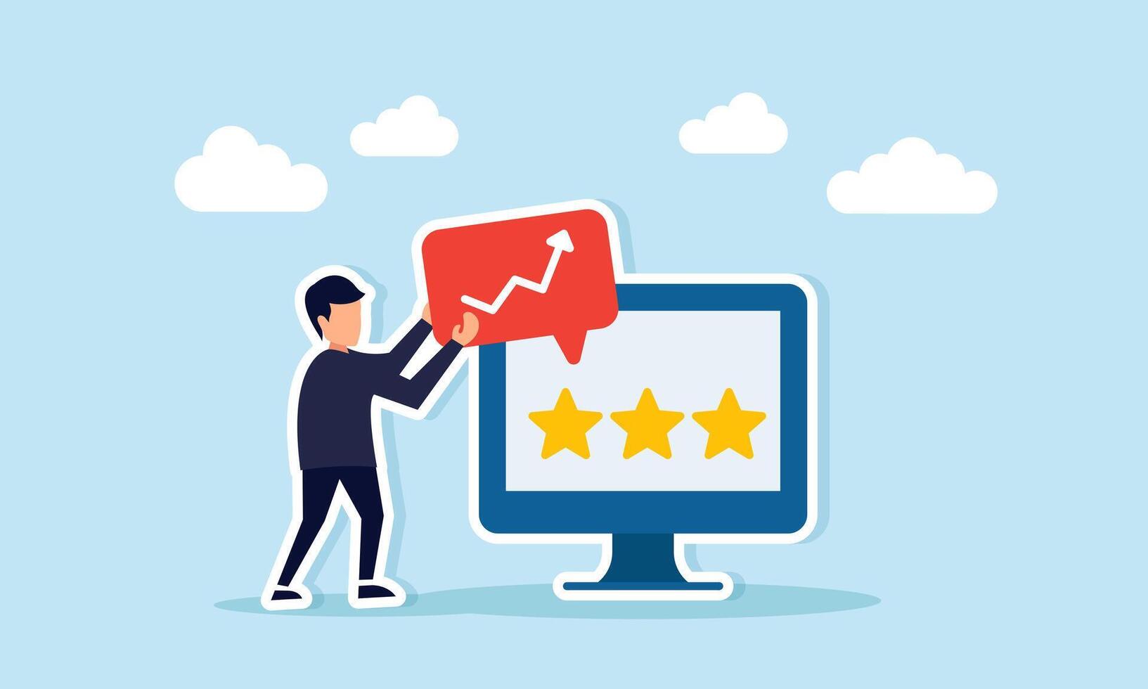Businessman holding a check-marked chat dialog next to a monitor with three stars, illustration of improving quality aligned with better business performance Pro Vector