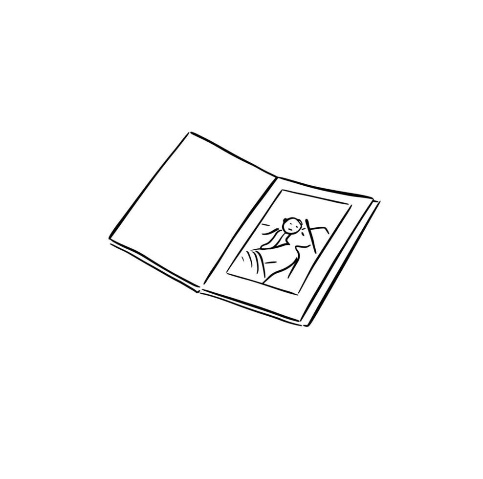 An open book with a photo on inside page. Illustration in a sketchy style. Pro Vector