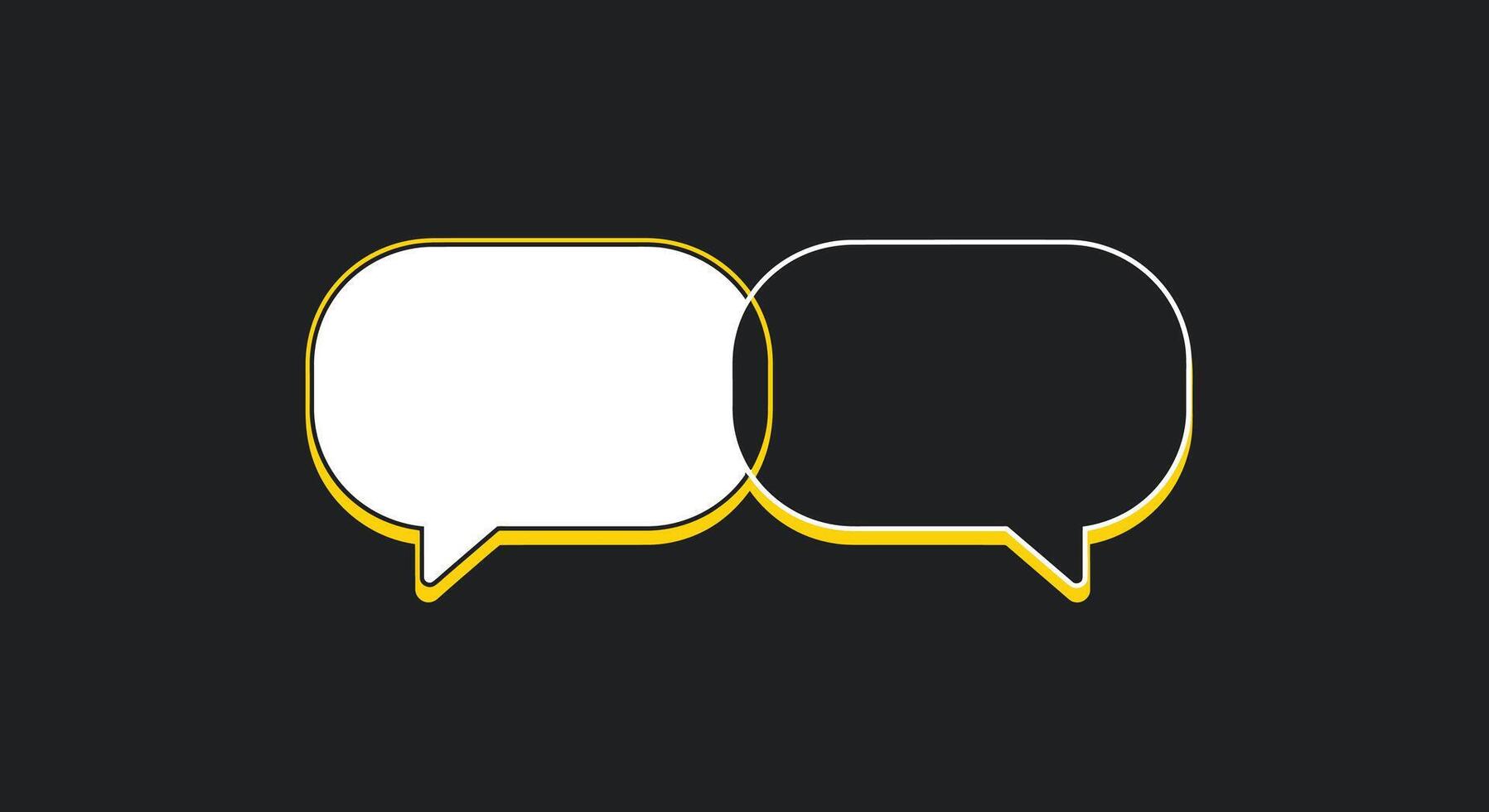 A Overlapping Black and White Speech Bubbles,Conversation Cloud,Dialogue Balloons Intersecting,Thinking and Speaking Communication Bubbles, both empty with Yellow on black background Pro Vector