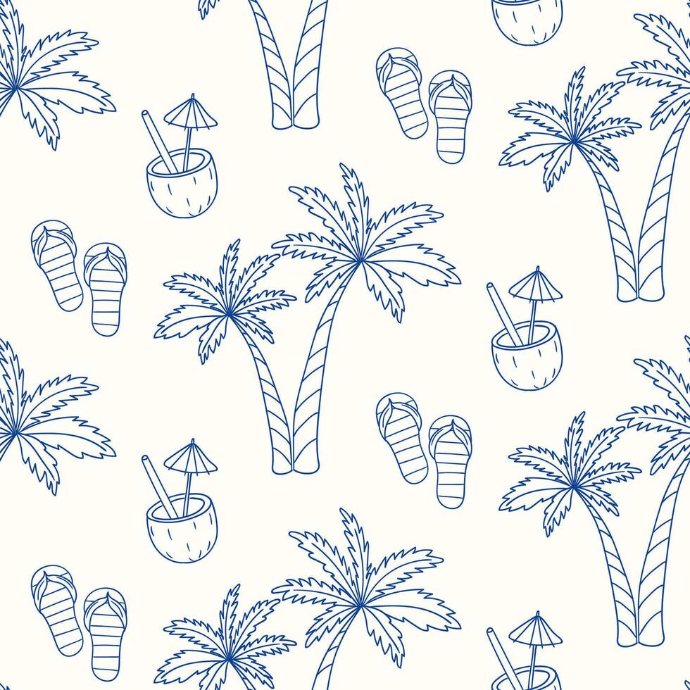 Relaxing beach scene with palm trees, coconuts, and flip-flops perfect for summer vibes Pro Vector