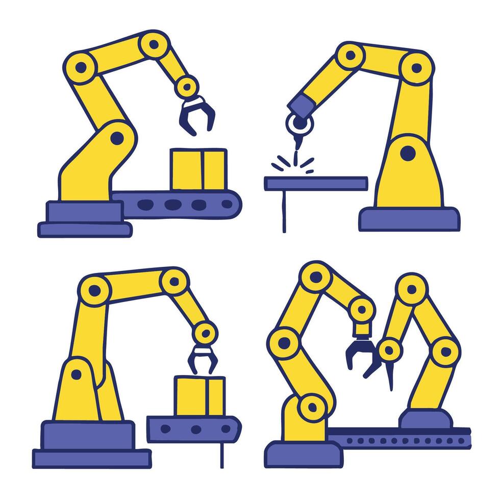 Robotic arms performing various tasks in factory setting, showcasing automation and efficiency Pro Vector