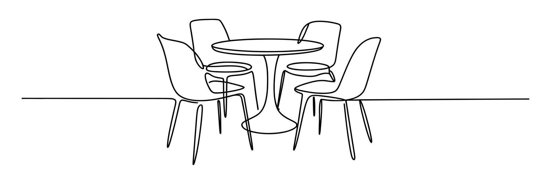 Continuous Line Drawing of a Round Table with Four Modern Chairs in a Minimalist Style Pro Vector