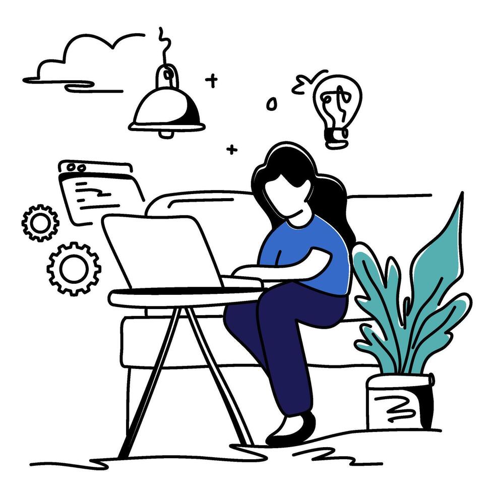 Web Development Process Illustration. Woman with laptop and various design elements. Minimalist design. Perfect for explaining web creation. Comprehensive, structured feel Pro Vector
