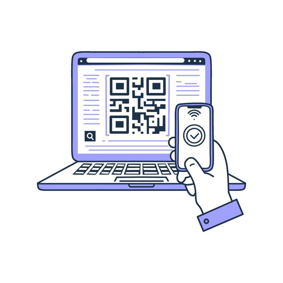 Mobile QR code scan on laptop. Hand holds phone, scans screen. Digital payment, online access. Modern tech, bright scene Pro Vector
