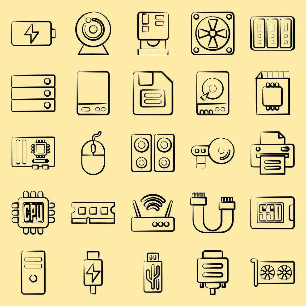 Icon set of computer components. Computer components elements. Icon in hand drawn style. Pro Vector