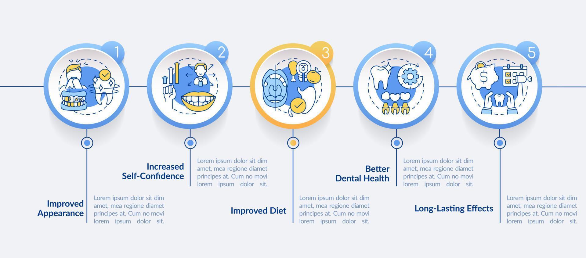 Aesthetic dentistry benefits circle infographic template. Improved diet. Data visualization with 5 steps. Process timeline info chart. Workflow layout with line icons. Lato-Bold, Regular fonts used Pro Vector