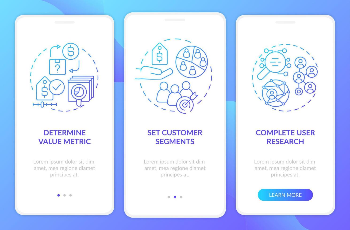 Building pricing strategy blue gradient onboarding mobile app screen. Walkthrough 3 steps graphic instructions pages with linear concepts. UI, UX, GUI template. Myriad Pro-Bold, Regular fonts used Pro Vector