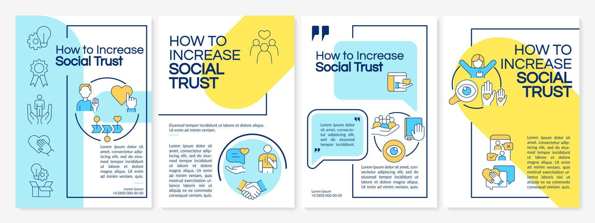 Increase social trust blue and yellow brochure template. Booklet print design with linear icons. Vector layouts for presentation, annual reports, ads. Questrial-Regular, Lato-Regular fonts used Pro Vector