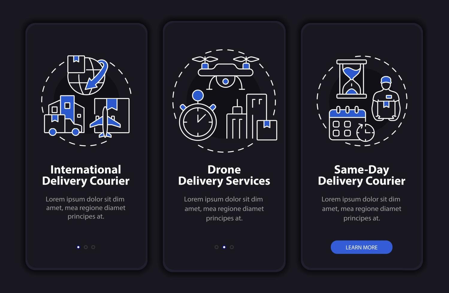 Courier delivery business night theme onboarding mobile app screen. Mailing walkthrough 3 steps graphic instructions pages with concepts. UI, UX, GUI template. Myriad Pro-Bold, Regular fonts used Pro Vector