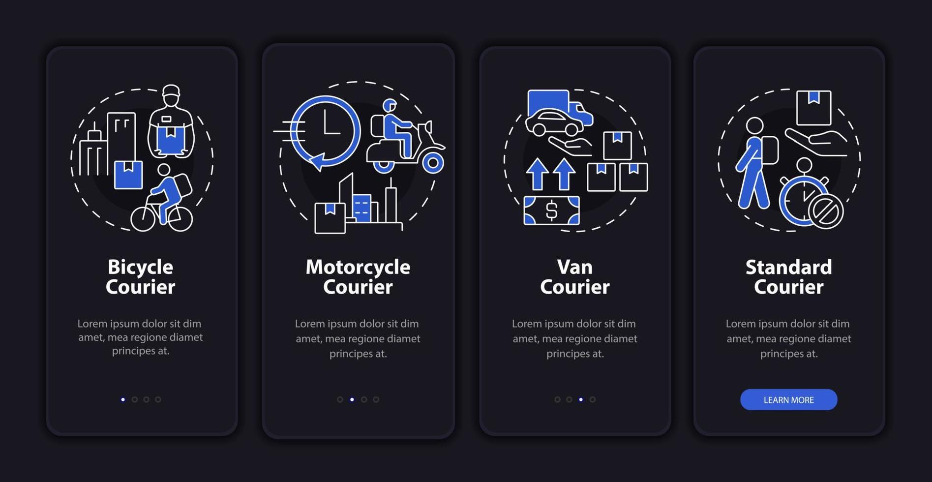 Courier business night theme onboarding mobile app screen. Delivering walkthrough 4 steps graphic instructions pages with linear concepts. UI, UX, GUI template. Myriad Pro-Bold, Regular fonts used Pro Vector