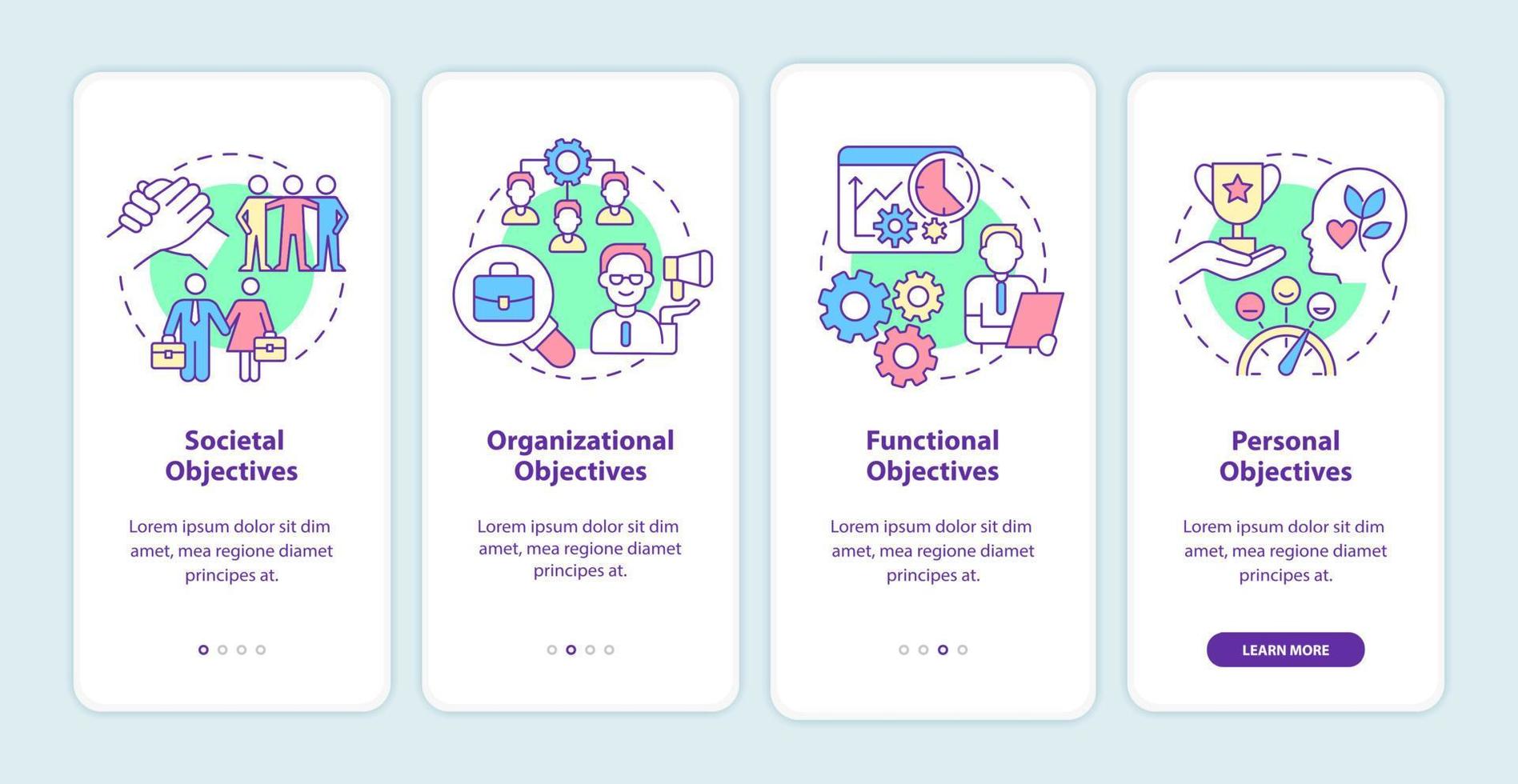 Objectives of Human resources management onboarding mobile app screen. Walkthrough 4 steps graphic instructions pages with linear concepts. UI, UX, GUI template. Myriad Pro-Bold, Regular fonts used Pro Vector