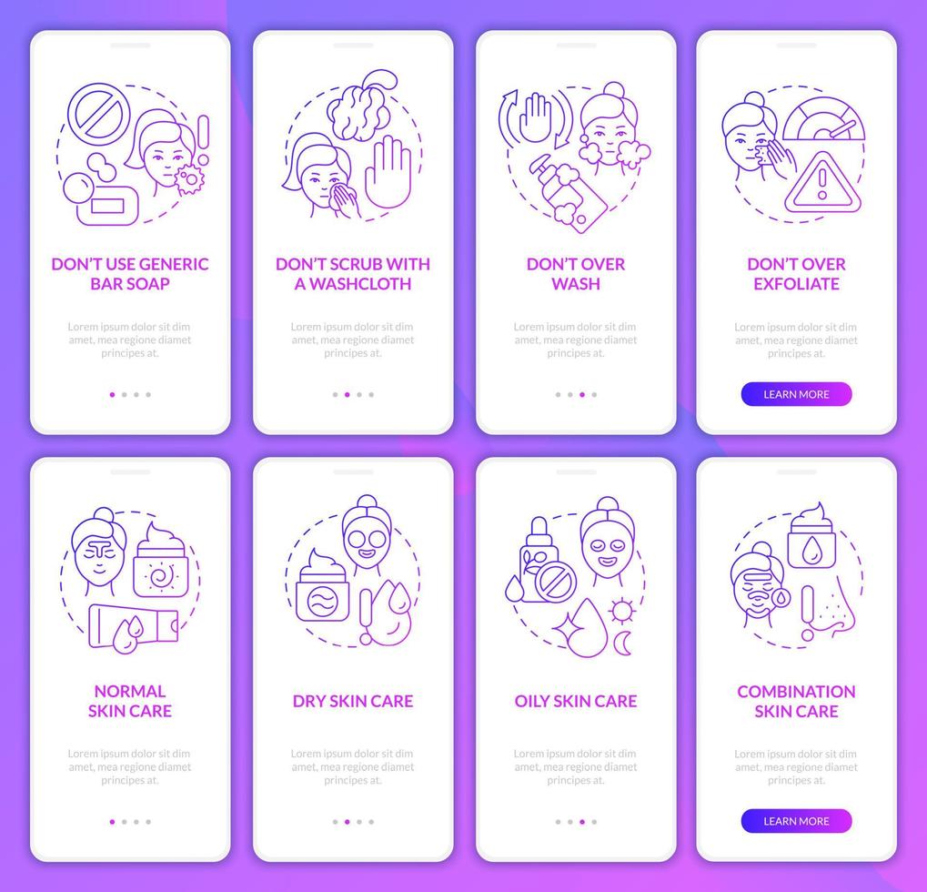 Skincare routine purple gradient onboarding mobile app screen set. Beauty walkthrough 4 steps graphic instructions pages with linear concepts. UI, UX, GUI template. Myriad Pro-Bold, Regular fonts used Pro Vector