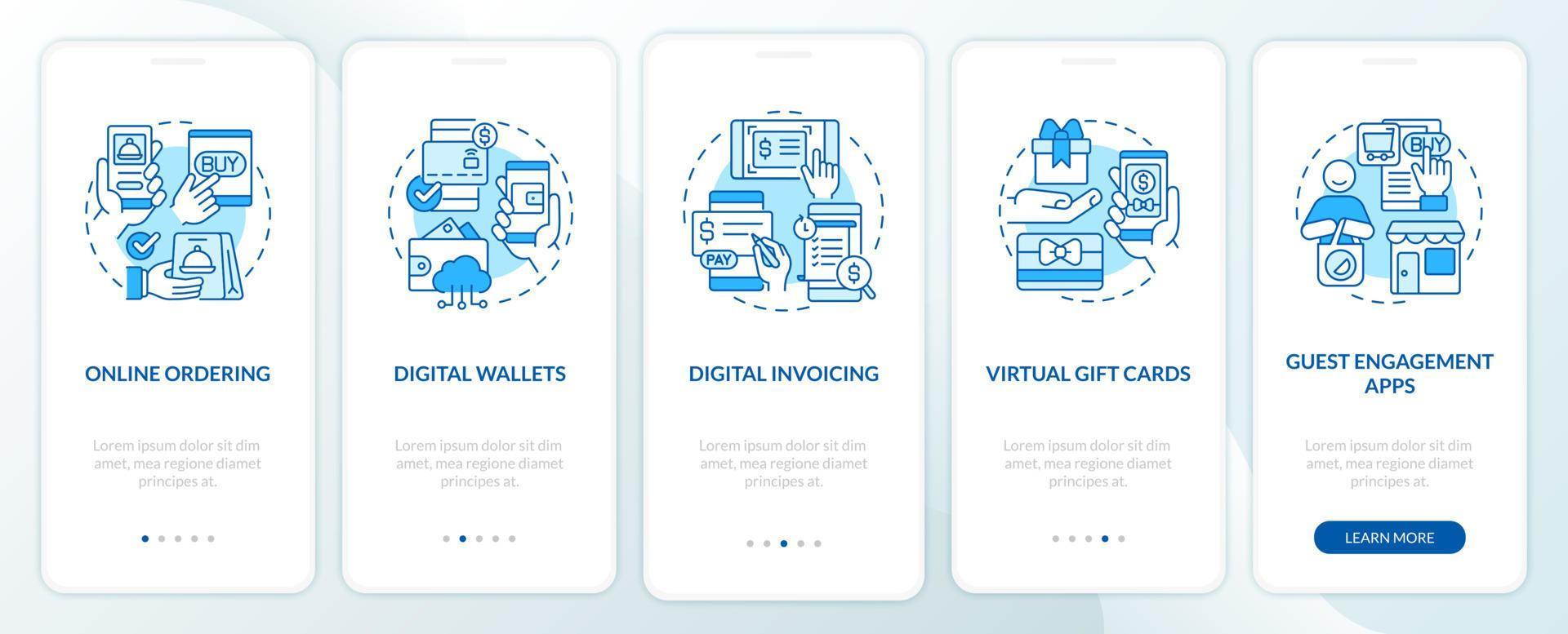Contactless solution examples blue onboarding mobile app screen. Service walkthrough 5 steps graphic instructions pages with linear concepts. UI, UX, GUI template. Myriad Pro-Bold, Regular fonts used Pro Vector