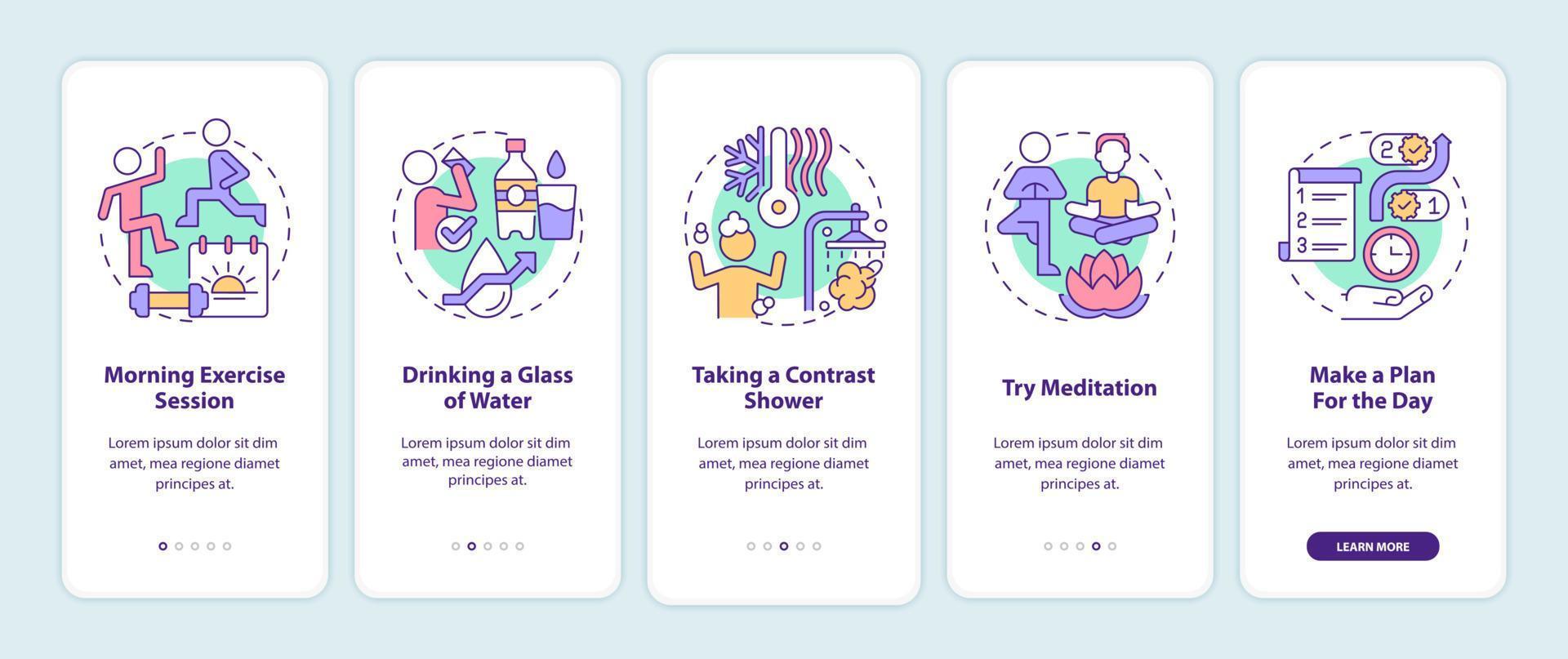 Daily routine onboarding mobile app screen. Selfcare for wellness walkthrough 5 steps graphic instructions pages with linear concepts. UI, UX, GUI template. Myriad Pro-Bold, Regular fonts used Pro Vector