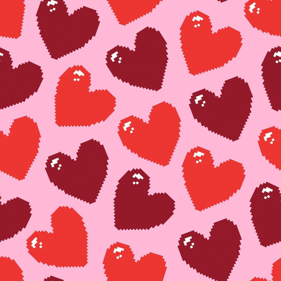 Romantic seamless pattern with red pixel heart on a soft pink background. Hand drawn illustration for wrapping paper, textile, fabric. Pro Vector