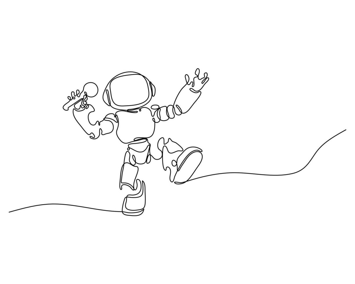 Continuous line art of a robot singing with a microphone, energetically performing. Futuristic technology meets lively entertainment in this minimalistic digital sketch. Pro Vector