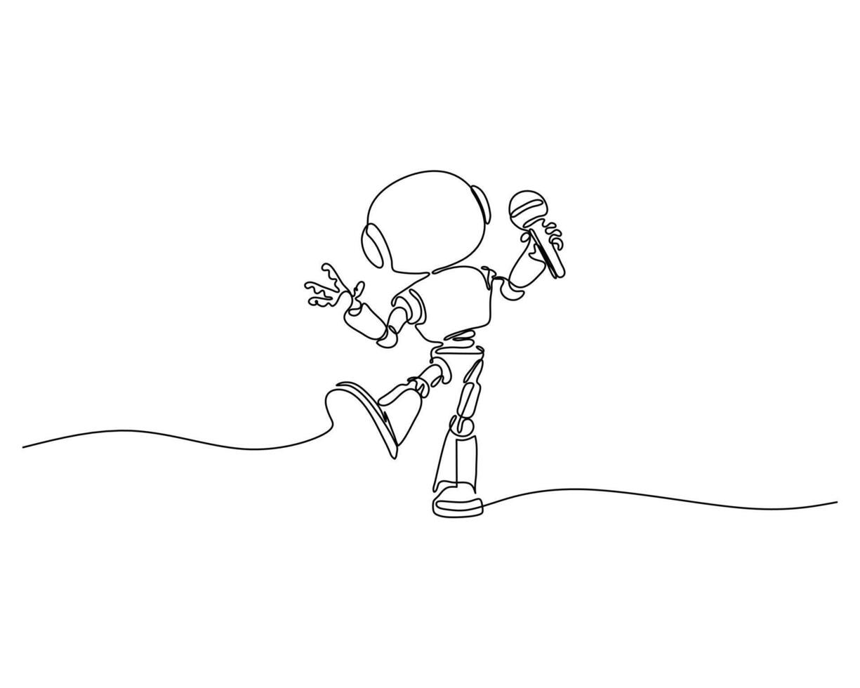 Continuous line drawing of a joyful robot performing with a microphone, minimalistic and dynamic design, ideal for music, technology, and entertainment concepts. Pro Vector