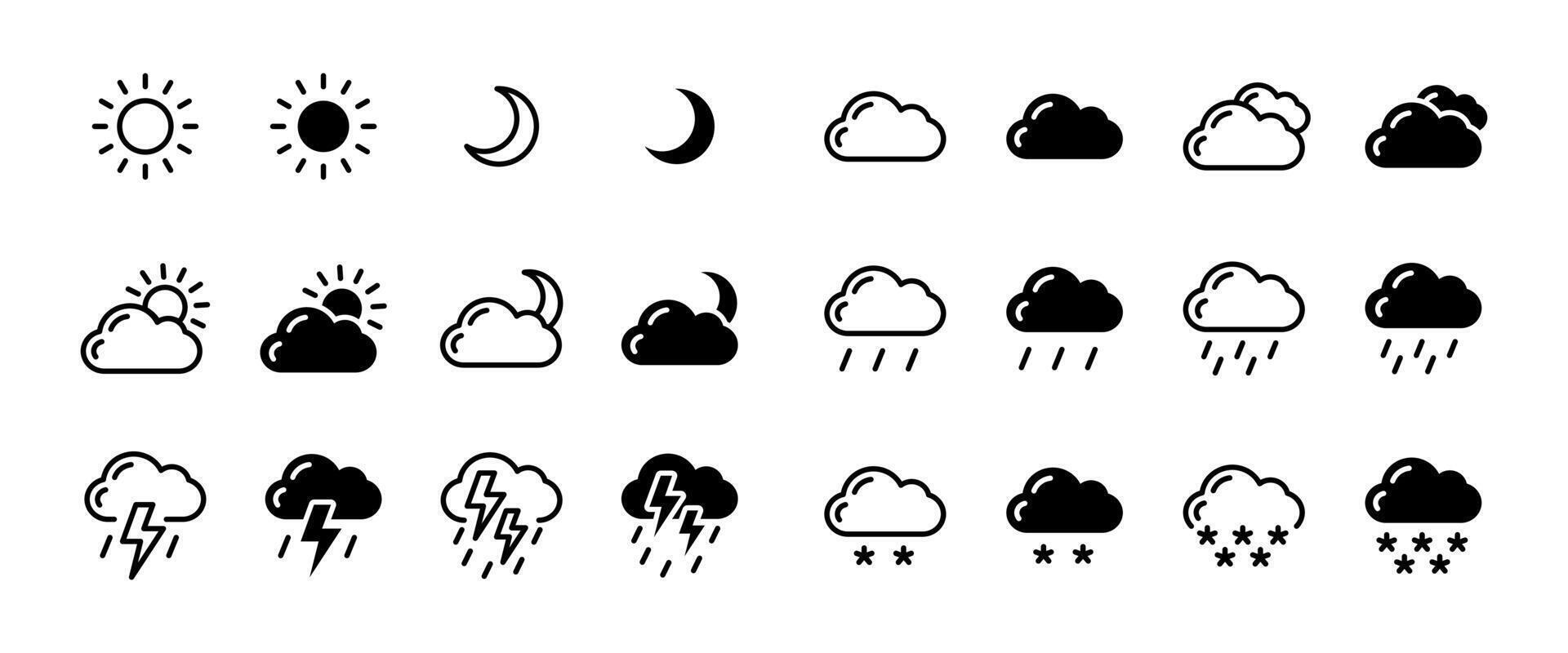 Weather icon set. Line and filled illustrations of sun, rain, clouds, snow and thunder. Meteorological symbols for forecasts, climate apps, UI interfaces and environmental reports. Pro Vector