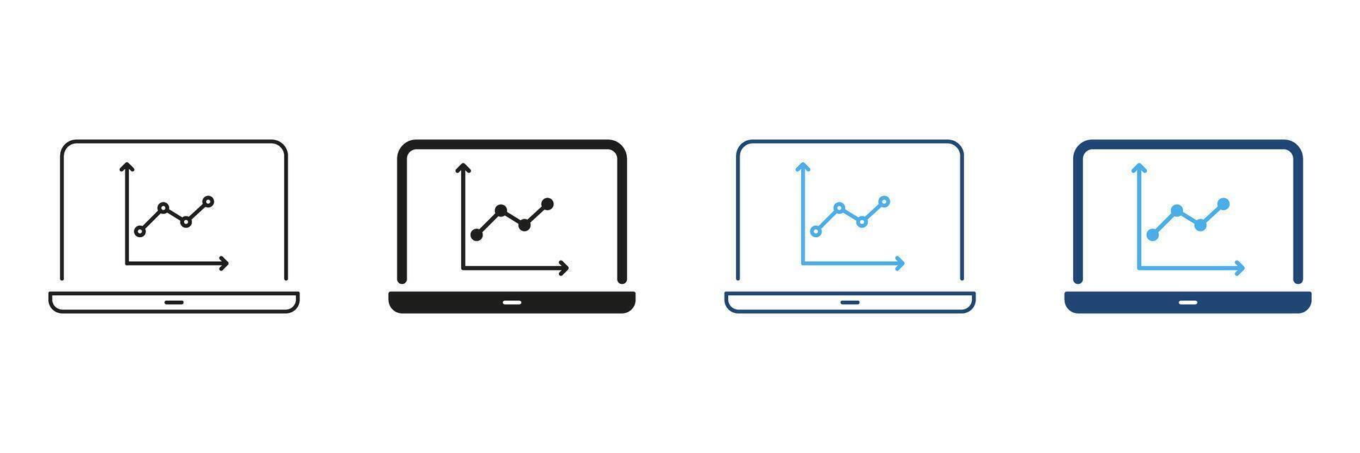 Laptop With Graph Line And Solid Icon Set. Data Analysis, Business Analytics, And Performance Tracking Symbol Collection. Financial And Statistical Insights. Isolated Illustration Pro Vector