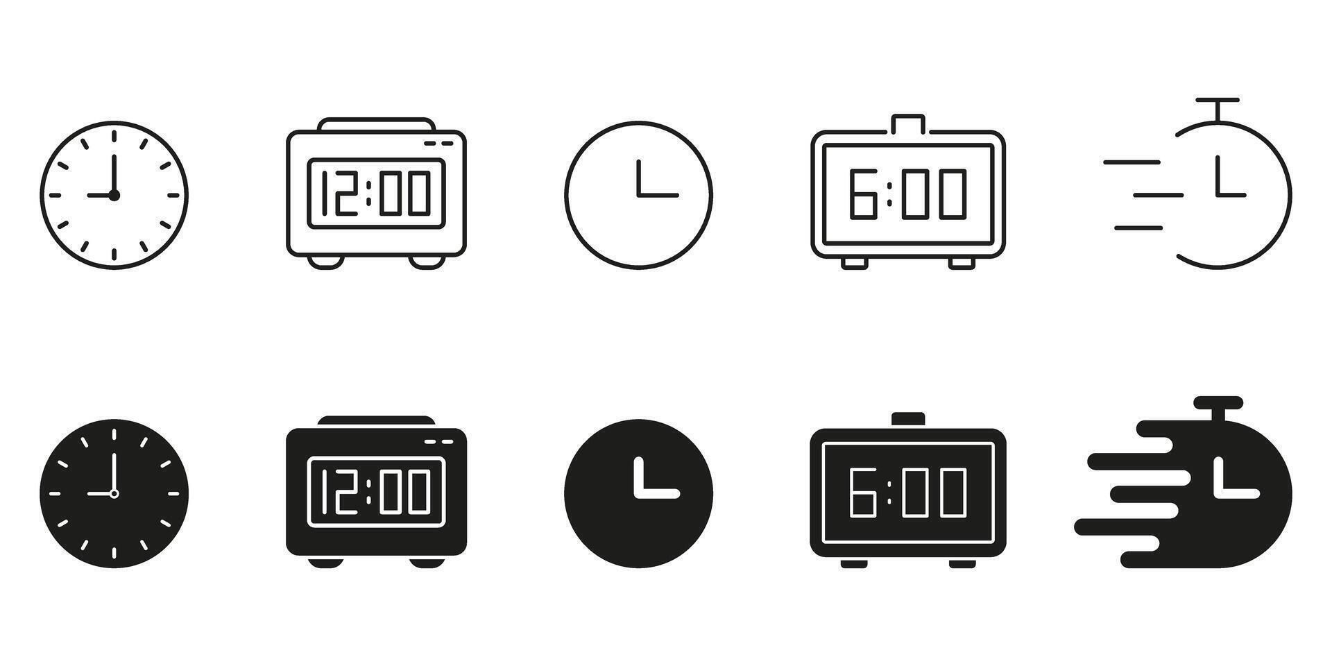 Clock And Timer Line And Solid Icon Set. Time Management, Alarm, And Speed Tracking Symbol Collection. Includes Analog Clocks, Digital Clocks, And Stopwatch Designs. Isolated Illustration Pro Vector